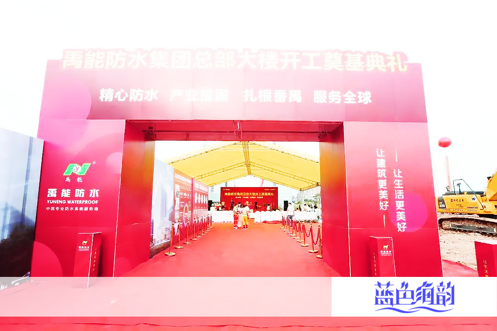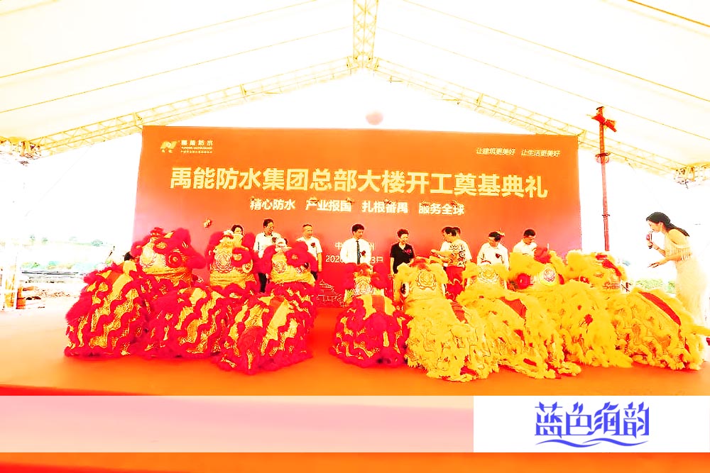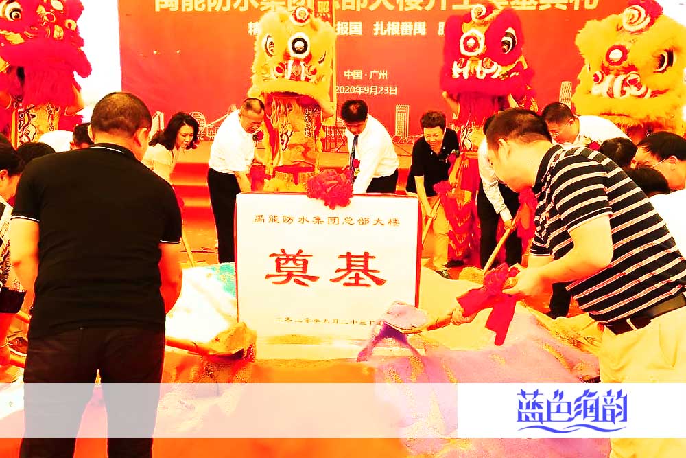 「藍色海韻」廣東省廣州市番禺區開工奠基動工典禮慶典儀式活動策劃4A專業服務執行公司公關傳媒廣告禮儀案例,金秋時節綻放金色的夢想,金色大地收獲金色的未來。禹能防水集團總部大樓開工奠基典禮,在廣州番禺工業經濟總部園區順利舉行,眾領導嘉賓出席慶典活動現場,共同見證禹能防水這一歷史時刻。受邀領導嘉賓們共同上臺進行醒獅點睛以及為禹能防水集團總部大樓開工培土奠基。